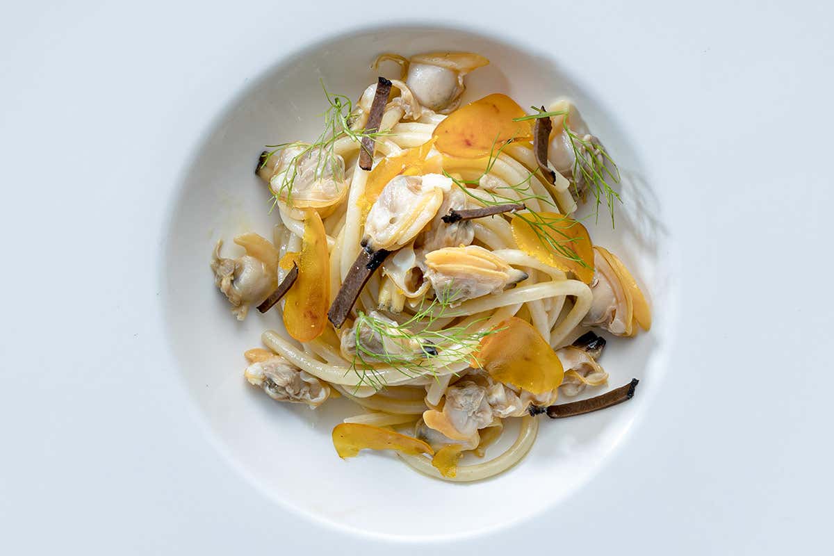 Successivamente togliere dal fuoco e eliminare metà guscio, lasciando quello dove c’è il frutto, fil- trare l’acqua di cottura e farla ridurre leggermente; rimettere le vongole in padella e lasciare riposa- re aggiustando di sale aromatizzato al mirto.