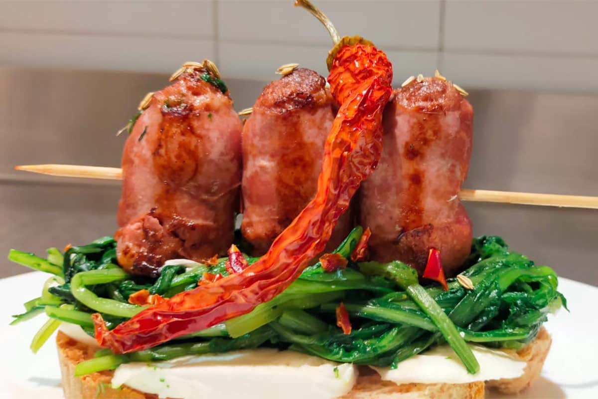 Questo è un piatto povero della Calabria, anticamente composto solo da salsiccia e pane, trasformato dallo chef Roberto Cipolla, socio Euro-Toques Italia, in chiave nutraceutica con l’aggiunta di cicoria e pane.