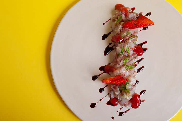 Tartare di spigola con fragola, basilico e riduzione di vino rosso