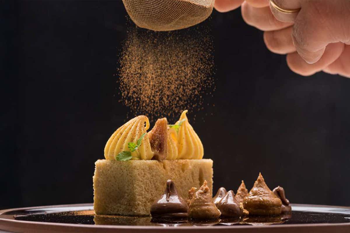 Questo dessert al piatto firmato dallo chef Michelangelo Sparapano, membro della Nazionale Italiana Cuochi, è una raffinata reinterpretazione del tiramisù, pensata per l’alta ristorazione contemporanea. La classica crema al tiramisù viene alleggerita e resa setosa, affiancata da una ganache montata al caffè dal profilo elegante e persistente. Il cake alla cannella, soffice e aromatico, viene valorizzato da una bagna al caffè e latte di mandorla che aggiunge profondità e una nota delicatamente tostata. Il crumble al cacao introduce una componente croccante che equilibra la morbidezza delle creme, mentre la spolverata finale di cacao amaro richiama l’identità del tiramisù tradizionale.