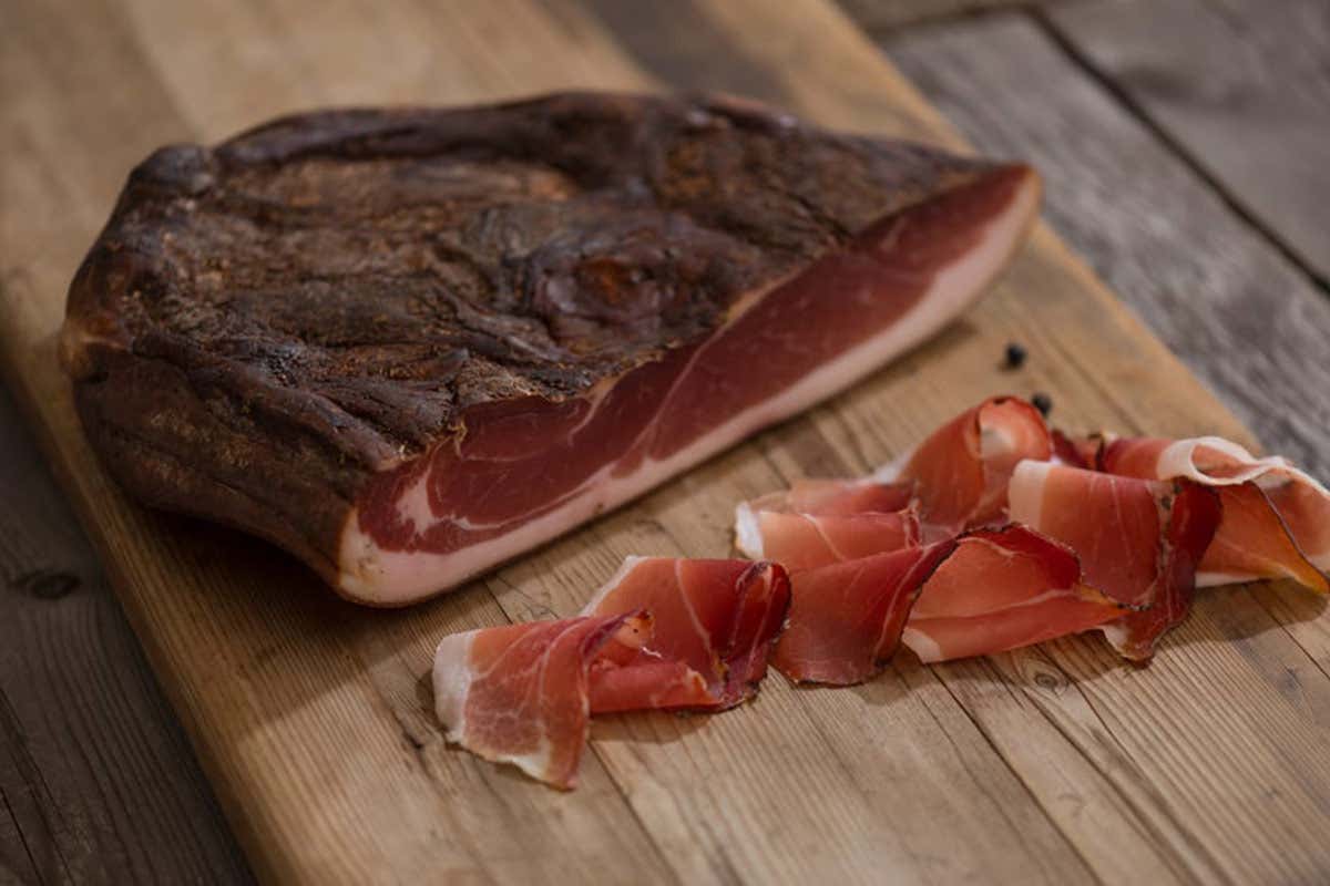 Frutto di una lavorazione artigianale tramandata da generazioni, lo Speck Alto Adige IGP Recla è realizzato con cosce di suino selezionate, salate a mano e speziate secondo un’antica ricetta di famiglia. L’affumicatura delicata con legno di faggio e la stagionatura naturale di almeno 22 settimane, tra le fresche correnti alpine che scendono dai ghiacciai dell’Ortles e della Palla Bianca, conferiscono al prodotto un profumo inconfondibile e un gusto equilibrato: morbido, avvolgente e leggermente speziato.