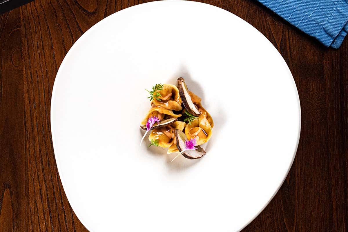 Tortelli ripieni di agnello al forno, jus e porcini Tortelli ripieni di agnello al forno, jus e porcini