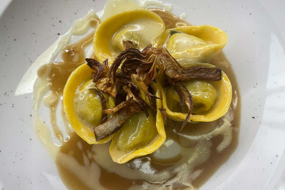 Il tortello ripieno di animelle e carciofi firmato dallo chef Daniele Roppo per Il Marchese è un piatto di alta cucina che unisce tecnica, profondità gustativa e identità romana. La sfoglia ricca, realizzata con farina 00 e semola rimacinata, avvolge una farcia complessa e armonica: animelle rosolate e battute a coltello, carciofi romaneschi lavorati in doppia consistenza, patata farinosa per legare e pecorino romano a dare spinta sapida.