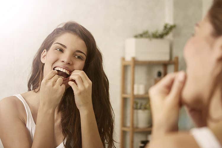 - passare il filo interdentale: meglio la sera quando la bocca resta esposta più a lungo all’azione dei batteri. Inserire gentilmente il filo sotto il colletto gengivale passandolo da una parete all’altra del dente, evitando di farlo affondare nella gengiva e di sfregarlo tra dente e dente.