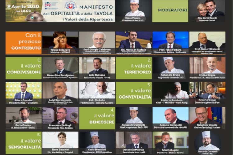 Ma in che modo la ristorazione italiana e l’intero comparto gastronomico nazionale potranno ripartire dopo l’emergenza Covid -19? Una domanda importante a cui Rocco Pozzulo (Presidente FIC - Federazione Italiana Cuochi), Aldo Cursano (Presidente Vicario FIPE - Federazione Italiana Pubblici Esercizi), Roberto Calugi (Direttore Generale FIPE), Manlio Di Stefano(Sottosegretario di Stato e Ministero degli Affari Esteri e della Cooperazione Internazionale), Teresa Bellanova (Ministro delle Politiche agricole alimentari e forestali), Walter Ricciardi (Consigliere del Ministro della Salute, membro OMS, consigliere per le relazioni dell’Italia con gli organismi sanitari internazionali per COVID-19), Ettore Prandini (Presidente Coldiretti), Giorgio Calabrese (Presidente Comitato Nazionale Sicurezza Alimentare Ministero della Salute), gli chef stellati Enrico Crippa (Presidente Bocuse d’Or Italy Academy), Carlo Cracco (Vice Presidente Bocuse d’Or Italy Academy) e Umberto Bombana (Ottoemezzo, Hong Kong), Antonello Maietta(Presidente Associazione Italiana Sommelier), Fabio Fortuna (Rettore UnicCusano), Luigi Scardamaglia (Consigliere Delegato Filiera Italia), Francesco Guidugli (Presidente Nazionale Solidus), Gioacchino Bonsignore (Giornalista, Gastronomo TG5 Gusto),