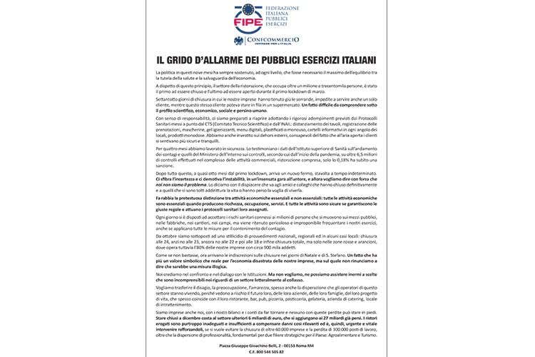 Dopo la grande protesta che aveva portato nelle piazze d’Italia 10mila imprenditori, la Fipe ha scelto ora la formula di una pagina a pagamento pubblicata sul Corriere della sera, che di seguito riportiamo integralmente condividendone ogni passaggio. in cui e sprimne lo sconcerto e la delusione per le scelte senza logica e senza supporto scientifico compiute dal Governo.