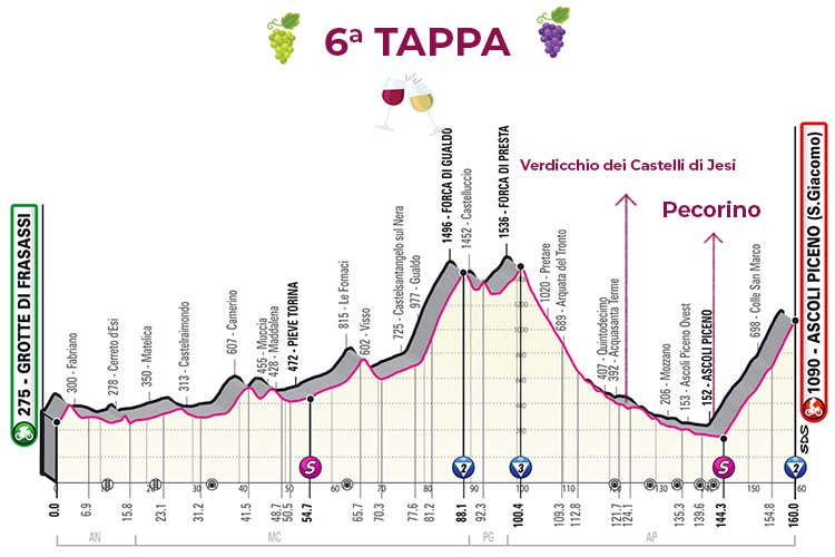 Castelli di Frasassi (An) e arriva ad Ascoli Piceno dopo che ieri l'australiano Caleb Ewan si è imposto nella volata di Cattolica su Giacomo Nizzolo ed Elia Viviani. Tappa marchigiana che dirà un po' di più sullo stato di forma dei big della classifica generale visto che l'altimetria presenta salite di 2ª categoria e il primo arrivo in salita al termine di un'ascesa di 15 km con pendenza media del 6%. Largo ai nomi altisonanti: Bernal, Evanepoel, Nibali, Bardet, Almeida, Yates, Hindley. Non sarà della corsa invece Mikel Landa che ieri è caduto rovinosamente a 5km dall'arrivo ed è stato costretto a ritirarsi per le botte riportate ad una spalla. Un vero peccato soprattutto dopo la sua ottima prestazione di Sestola.
