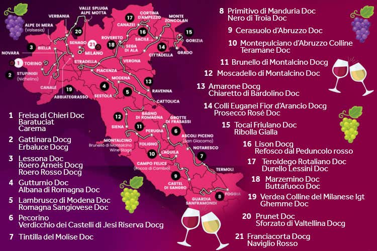 Il Giro d'Italia è un viaggio alla scoperta del nostro Paese in grado di regalare ad ogni viaggiatore una visita costante delle meraviglie che rendono la nostra Penisola tra le zone più belle del mondo. Tra i simboli dell'Italia c'è senza dubbio il vino e i vigneti da cui nascono le bottiglie; sempre più spesso ormai gli organizzatori della Corsa Rosa cercano di legare le tappe a qualche vino simbolo del nostro patrimonio enologico. Ecco perchè noi di Italia a Tavola abbiamo deciso per questa edizione numero 104 di accompagnare i girini con alcune etichette a nostra scelta, simbolo delle zone attraversate dalla corsa. Da qui e fino alla fine della corsa percorreremo le 21 tappe in calendario analizzando alcune etichette emblema dei territori attraversati, tra nomi blasonati e qualche chicca.