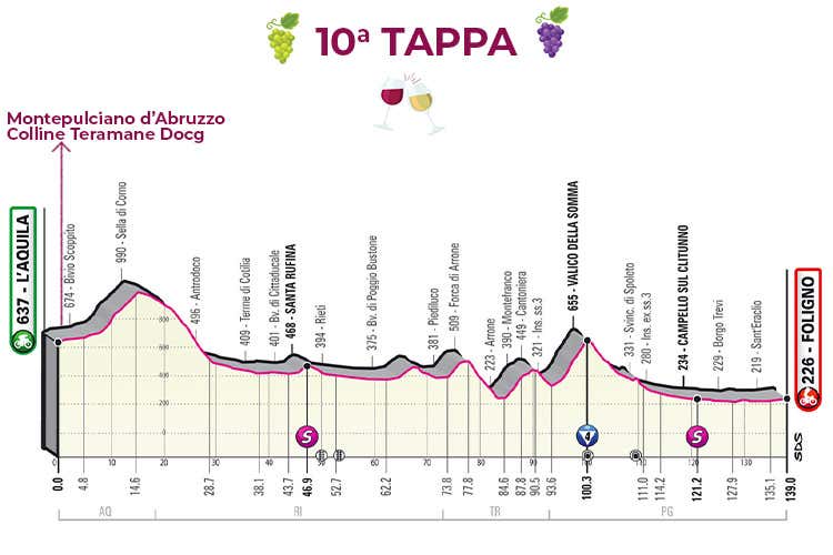 Dopo il tappone di ieri oggi tornano protagoniste le ruote veloci. Si va da L'Aquila a Foligno con il Montepulciano d’Abruzzo Colline Teramane Docg protagonista