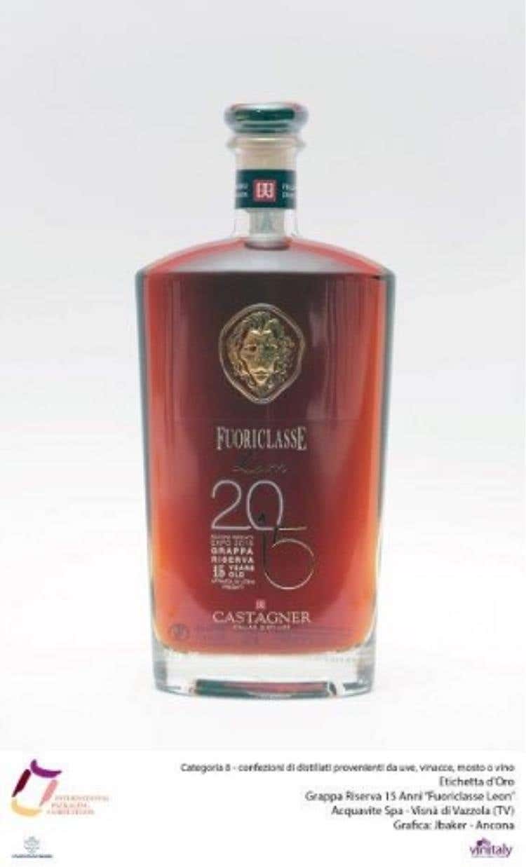 Categoria 8: confezioni di distillati provenienti da uve, vinacce, mosto o vinoEtichetta d’OroGrappa Riserva 15 Anni “Fuoriclasse Leon”