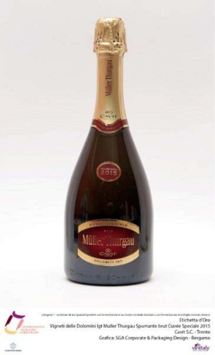 Categoria 7: confezioni di vini spumanti prodotti con fermentazione in autoclave (metodo charmat) e con fermentazione in bottiglia (metodo classico)Etichetta d’OroVigneti delle Dolomini Igt Muller Thurgau Spumante brut Cuvée Speciale 2015