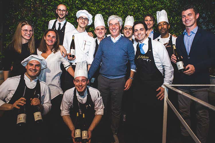 A sorpresa è arrivato in sala, per partecipare alla degustazione, il più gettonato allenatore di calcio del momento, mister Gian Piero Gasperini, che ha portato l’Atalanta al terzo posto nella classifica finale di Serie A e quindi alla qualificazione in Champions League. Nel suo primo giorno di libertà, Gasperini ha scelto Al Carroponte per rilassarsi e degustare una cena di qualità. Molto disponibile e schietto com’è, ha posato per una foto ricordo con il patron Mazzoleni e tutta la squadra che compatta lavora per questo locale, che in soli tre anni è arrivato ad essere tra quelli che a Bergamo fanno scuola e tendenza.