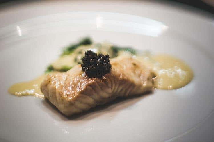 Storione bianco, con caviale Calvisius Tradition Royal, spinacini novelli e beurre blanc (I vini di Hofstätter Al Carroponte