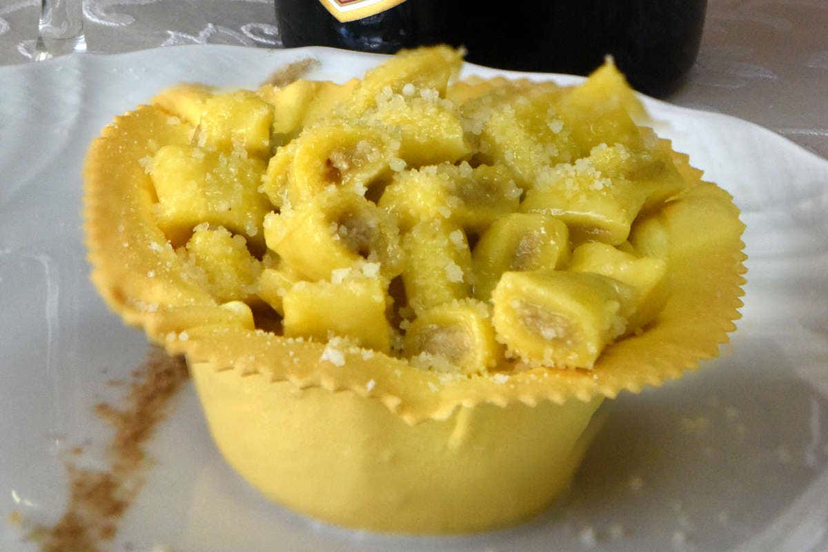 Procedimento: Per il ripieno fare un soffritto di sedano, carote e cipolle. Aggiungere tocchetti di cappello del prete di manzo, spuntature e carne di maiale, rosolare e sfumare con vino rosso, coprire con brodo vegetale e cuocere il tempo necessario per ridurre i liquidi. Passare il tutto al tritacarne. Aggiungere uova intere, parmigiano e pane grattugiato. Stendere in strisce la pasta all’uovo, mettere il ripieno in una sac a poche con il buco di mezzo centimetro e stendere il ripieno, arrotolare e tagliare a tocchetti di 1 centimetro, lessare, saltare in padella con abbondante burro e spolverare di parmigiano. Servire in cialde a cupola di pasta brisè essiccate in forno con salsa al parmigiano alla base