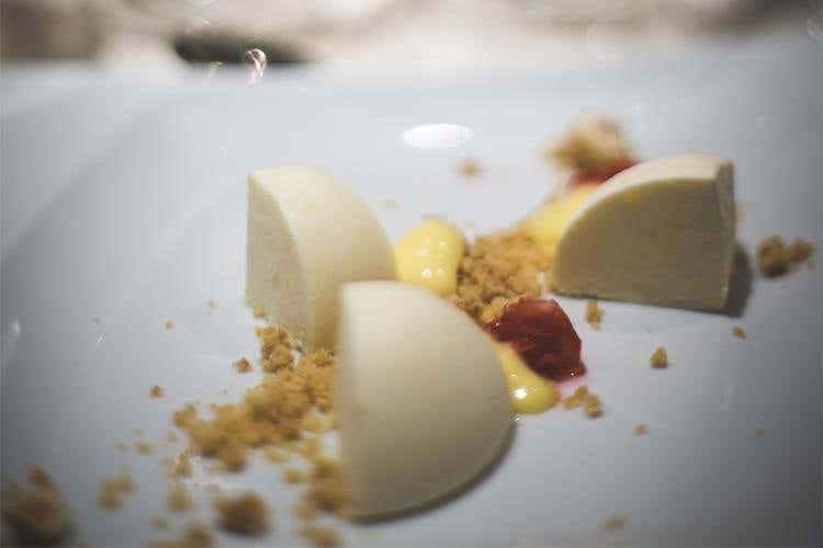 Piatto principale la Pancia di maialino arrostita all’arancia con broccolo romano, accompagnata dal sontuoso Blanc des Millénaires 2004: al naso limone, burro salato e crema inglese, al palato complesso e voluttuoso, apre citrico poi scopre gradualmente forza e carattere e nonostante tutto anche un’ottima mineralità. In chiusura del menu Bavarese al bergamotto, gelatina al gin e lamponi.