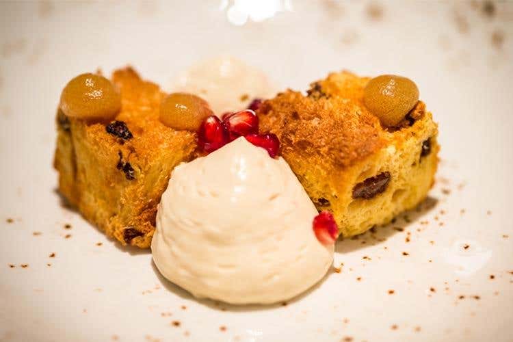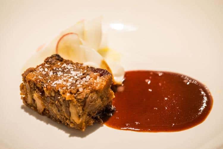 L’equilibrista sospeso tra il mondo del vino e quello della birra, realizzata con metodo Champenoise dopo una fermentazione unica di mosto di birra (Duchessa) e di Sangiovese, scelta per le Costine di maialino di cinta in terrina croccante, salsa barbecue alla birra e insalata di rape in marinata acidula, la Sedicigradi con i suoi sedici gradi alcolici e sedici mesi di maturazione ed invecchiamento in barrique ha accompagnato il risotto con pastinaca e radici di prezzemolo, cotechino sgranato croccante e olio al peperoncino. La dolce chiusura è stata affidata alla 25 dodici, anteprima natalizia, con il panettone, zabaione e gel alla birra e melograno.