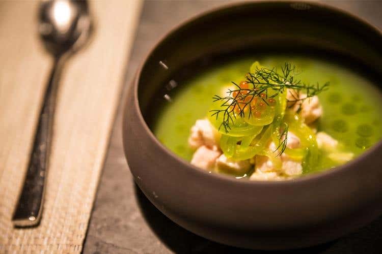 Salmerino di montagna con estratto di cetriolo e alla zucca in padella, i suoi semi croccanti salati, robiola di Roccaverano, cipollotto agro e mandarino