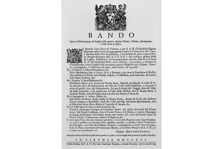 È il 24 settembre del 1716 quando, su ordine del granduca di Toscana Cosimo III, una “congregazione” (oggi definita commissione) composta da uomini esperti, altamente qualificati e saggi, stabilisce i confini delle quattro regioni di produzione vinicola per le quali era consentita l’esportazione al di fuori del Granducato di Toscana: il Bando s’intitolava “Sopra la dichiarazione de’ confini delle quattro regioni Chianti, Pomino, Carmignano e Vald’Arno di Sopra”, in cui l’area più estesa era rappresentata proprio da quel territorio compreso tra le città di Firenze e Siena in cui nasceva l’omonimo vino Chianti (poi diventato Chianti Classico).