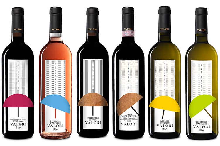 Valori sono state realizzate per i vini Montepulciano d'Abruzzo Biologico Doc, Trebbiano d'Abruzzo Biologico Doc, Cerasuolo d'Abruzzo Biologico Doc e Pecorino Biologico Doc Valori, cui si aggiungono quelle per le due Riserve Inkiostro Igt Colli Aprutini e Montepulciano d'Abruzzo Docg Colline Teramane Vigna Sant'Angelo.