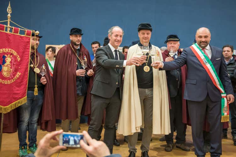Il governatore del Veneto Luca Zaia e il Gran Maestro Loris Dall’Acqua hanno stappato la prima bottiglia della Selezione Confraternita di Valdobbiadene vendemmia 2017, all’antica fiera di San Gregorio a Valdobbiadene.