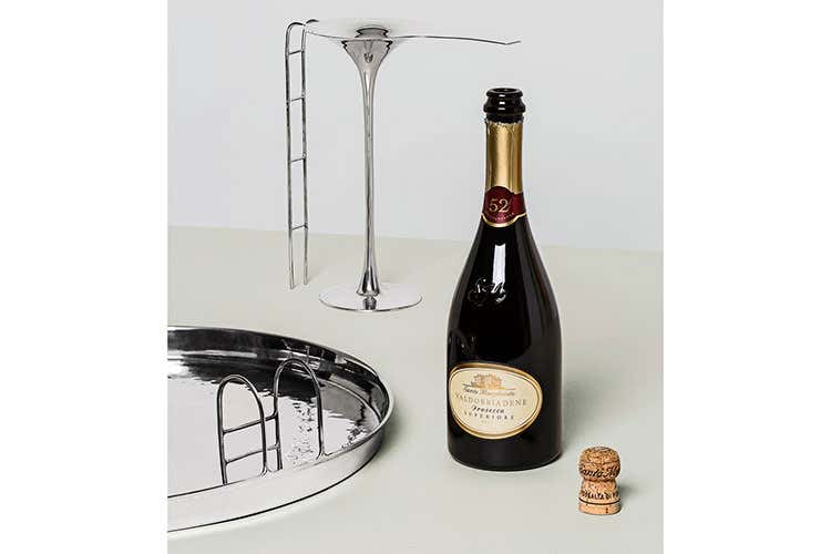 Studio Lido immagina un set per l’aperitivo formato da un grande vassoio circolare e una coppa per olive. È un paesaggio da tavola formato da un trampolino con scala che si proietta idealmente verso una grande piscina circolare, un teatro abitato dal sapore surreale in cui cibo e vino diventano i protagonisti del rito dell’happy hour. Attraverso l’estremizzazione di forme e proporzioni che specchiano, duplicano e deformano tutto ciò che li circonda, creano relazioni inattese capaci di evocare mondi del nostro immaginario collettivo. Luoghi possibili animati dai riflessi delle superfici martellate del peltro che vibrano come fossero onde, e da spessori sottili e delicati che esaltano l’espressività dell’antico materiale metallico. All’ironia e freschezza di questa combinazione si legano la raffinata eleganza e la danzante leggerezza che modellano il “52”, Prosecco Superiore che prende il nome dall’anno in cui Santa Margherita iniziò a spumantizzare le uve provenienti dall’area storica di Valdobbiadene. Da oltre sessant’anni questo nettare dai profumi di fiori di campo e di frutta a polpa bianca è l'ideale per i migliori happy hour.