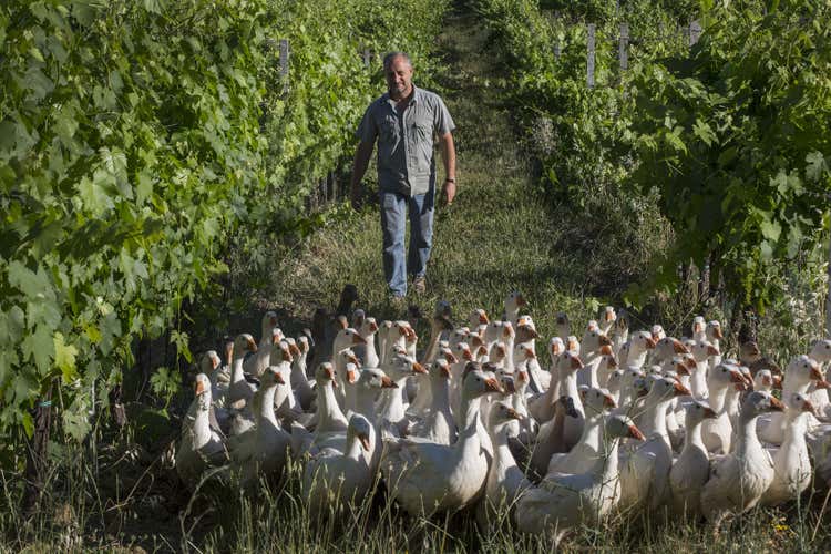 Si dichiara con orgoglio agricoltore e conduce i suoi 30 ettari secondo i principi dell’agricoltura biodinamica, sistema sostenibile e vantaggioso. Con il contributo degli animali nel vigneto.