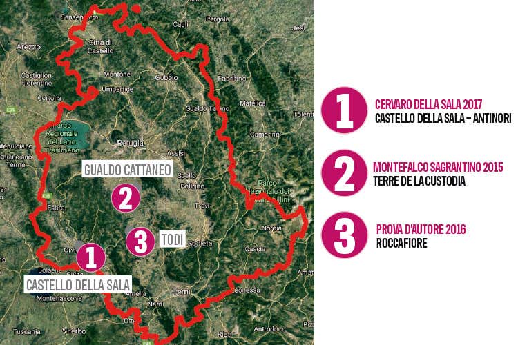 Una piccola regione con una tradizione vitivinicola che risale al periodo etrusco; indubbiamente vocata ai grandi rossi come il Sagrantino, ma con bianco di tutto rispetto come il Cervaro della Sala.