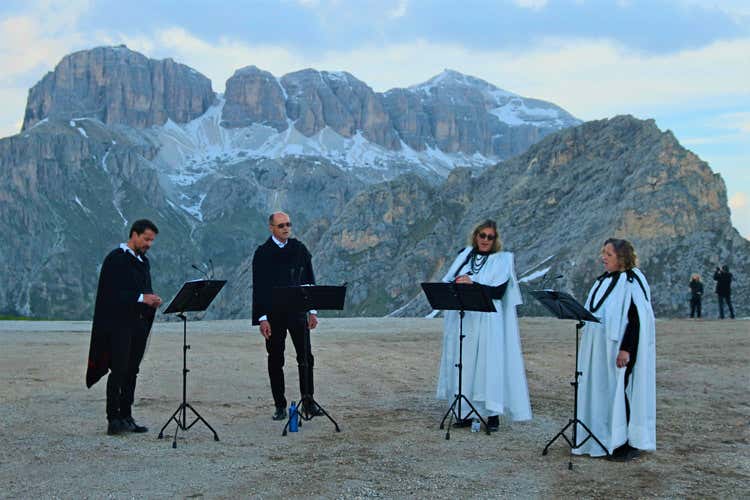 Emozionante ammirare il tramonto infuocato che si accende al calar della sera sulle Dolomiti con una vista mozzafiato sulla Marmolada, l’imponente Sassolungo e il Gruppo del Sella e in sottofondo le note del quartetto vocale “Demò ousc” e del pianista Paolo Bernard.