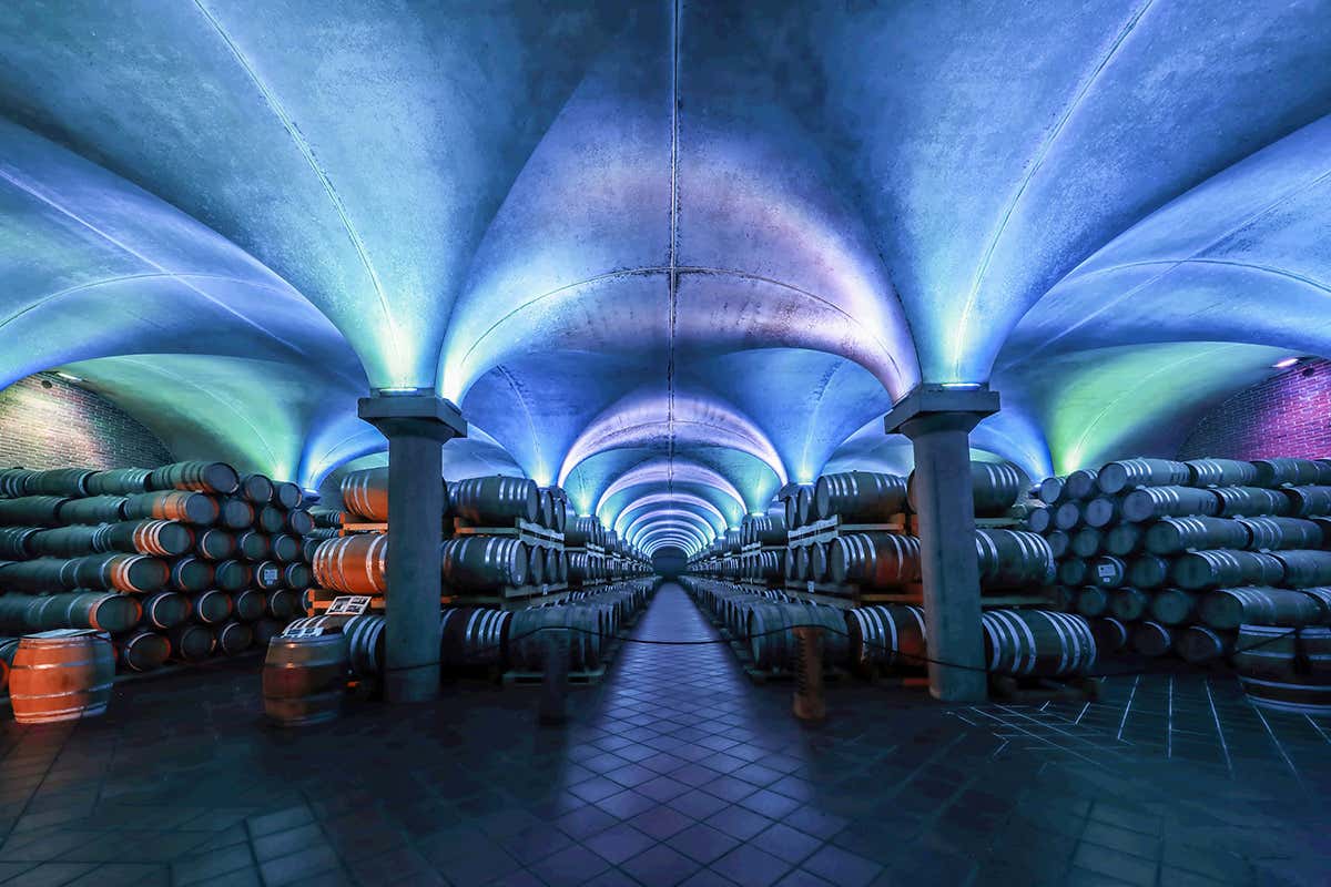 E qui si parte col capitolo dell’invecchiamento in botti da 13mila litri, dove il distillato rimane un anno. Trascorso il tempo prescritto, il prodotto viene trasferito in barrique, tonneaux o botti piccole, in relazione alle diverse tipologie. È la fase in cui entra in gioco la funzione, magica secondo alcuni, mistica secondo altri, della musica: le oltre 5mila botti riposano in cantina cullate dalle note dei grandi interpreti della musica classica. A completare l’atmosfera, luci a led che cambiano colore (senza generare calore all’interno della cantina) creando una cromoterapia che avvolge delicatamente l’ambiente.