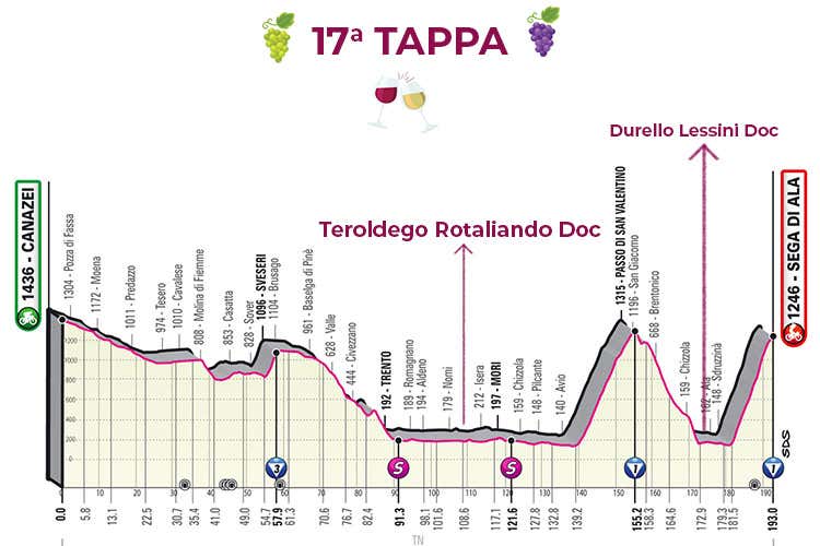 Il Giro d'Italia riparte dopo il secondo e ultimo giorno di riposo con una delle tappe decisive sia per durezza che perchè posta nella terza settimana, a 5 giorni soltanto dall'arrivo di Milano. Arrivo in salita a Sega di Ala dopo la partenza tutta in discesa da Canazei e il passaggio dal Gpm di San Valentino (1ª categoria) posto a 38 km dal traguardo. Sarà un'occasione per chi sogna ancora di vincere il Giro per attaccare Egan Bernal, la maglia rosa fino ad ora padrona totale del Giro.