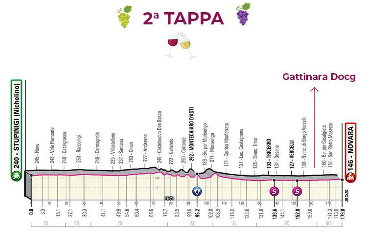 Il Giro d'Italia riparte dopo la prima tappa e lo fa presentando un'altimetria piatta visto che si attraversa la pianura piemontese. Si va da Stupinigi (Nichelino) e si arriva a Novara dopo 179 chilometri. Prima occasione per i velocisti che difficilmente si lascieranno scappare un'occasione simile. Tra i favoriti l'australiano Caleb Ewan, il tre volte campione del mondo, Peter Sagan e il nostro Elia Viviani.