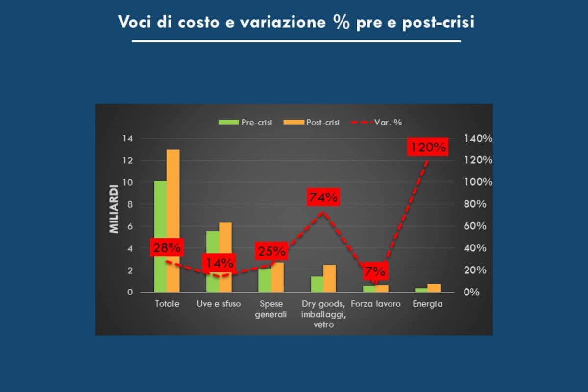 È una falla da quasi 1,5 miliardi di euro quella causata da gas ed energia sul vino italiano. Anche uno dei comparti del made in Italy più in salute è costretto a lanciare l’allarme e ora il timore principale è che all’escalation dei costi si aggiunga la crisi dei consumi, in Italia e nel mondo. Secondo l’indagine dell’Osservatorio Uiv-Vinitaly compiuta nell’ultima settimana sulle imprese del Belpaese, il surplus dei soli costi energetici (+425 milioni di euro) e, di conseguenza, delle materie prime secche (oltre 1 miliardo in più per vetro, carta, cartone, tappi, alluminio) valgono da soli un aumento dell’83% rispetto ai budget di inizio 2022. A questi si aggiungono altre voci in incremento (vino sfuso, costi commerciali, forza lavoro) che portano a un aumento dei costi totali di quest’anno del 28%. Il risultato, secondo l’indagine compiuta su un panel in rappresentanza del 30% del mercato, ha il sapore di una beffa per il settore.