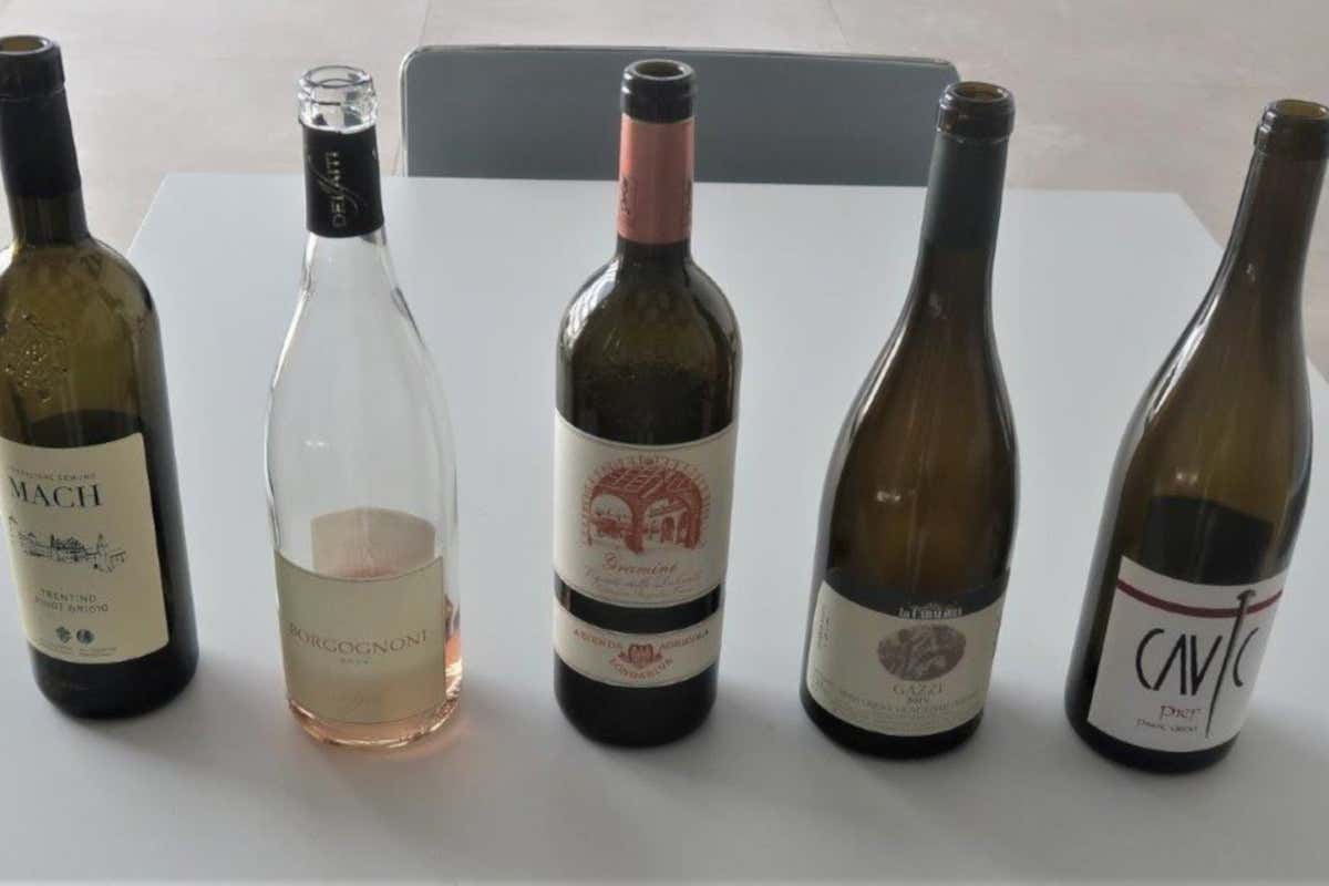 Cinque i Pinot Grigio in degustazione (alla cieca): il Pinot Grigio Fondazione Edmund Mach, color giallo paglierino con riflessi verdognoli, fresco, sapido, beverino. Piacevolissimo, splendido come aperitivo. Di tutt'altro colore (rosa Bandol) il Pinot Grigio Borgognoni di Igor Delaiti (Aldeno), dal bouquet agrumato, sapido in bocca, morbido, avvolgente e persistente, dotato di una robusta struttura. Può accompagnare molti piatti.