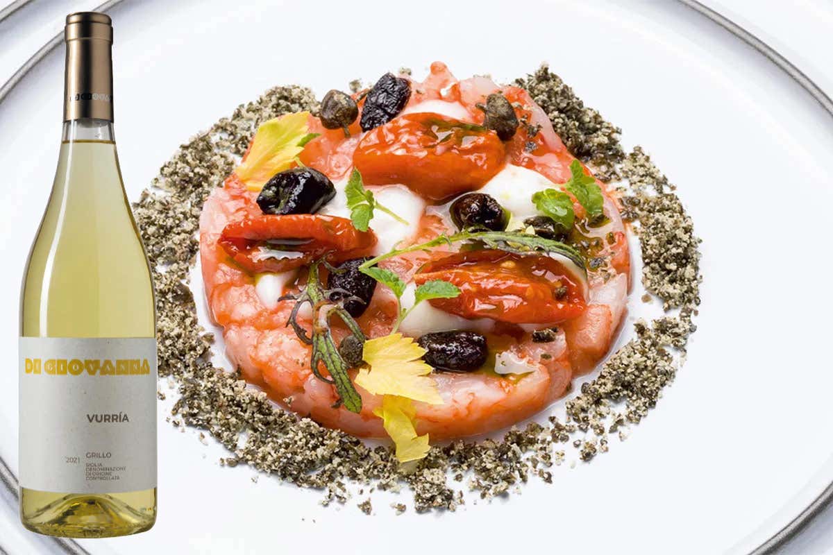Vurria Grillo Sicilia Doc Bio di Di Giovanna in abbinamento al Carpaccio di gamberi rossi alla pizzaiola dello chef Francesco Gotti della Nazionale Italiana Cuochi