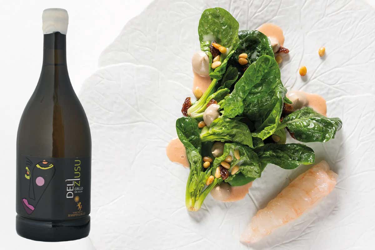 Deliziusu Grillo Bianco Sicilia Doc di Marchesi di Rampingallo in abbinamento agli Scampi, spinaci e basilico, pinoli e uvetta dello chef Antonio Romano del Ristorante Nove - Villa della Pergola Relais