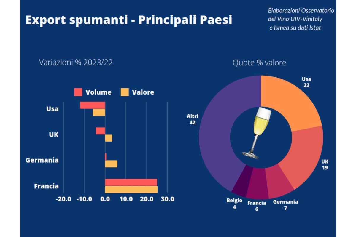 Per lo spumante italiano il 2023 ha visto la caduta in volume nei primi due mercati mondiali (Usa a -12%, Uk a -4,4%), ma anche una buona crescita nell’Est Europa e un andamento ancora più sostenuto in Francia, con un più 25%. Un exploit al quale, secondo l’Osservatorio Uiv-Ismea, ha contribuito l’effetto sostituzione dello Champagne con il Prosecco (+21%) anche dettato dal minor potere di acquisto dei consumatori transalpini. La geografia dell’export vede una divaricazione netta tra i risultati ottenuti nell’Ue (+5,6% volume e +4,1% valore) ed extra-Ue (-7,5% volume e -4% valore).