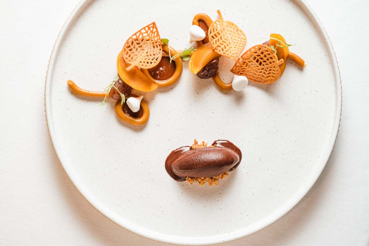 Raviolini di zucca, castagne all’Armagnac, caramello salato e gelato al cioccolato di Moma