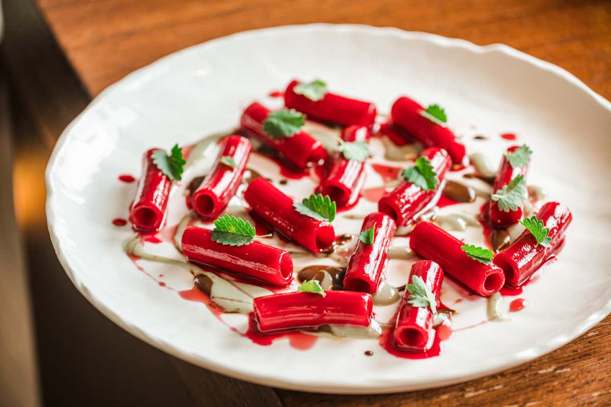 Rigatoni alla rapa rossa, erborinato, aglio nero e pimpinella di Moma