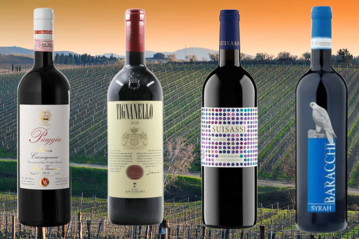 Il Carmignano Doc Riserva di Piaggia, il Tignanello di Marchesi Antinori il Suisassi di Duemani e il Cortona Syray Riserva di Baracchi