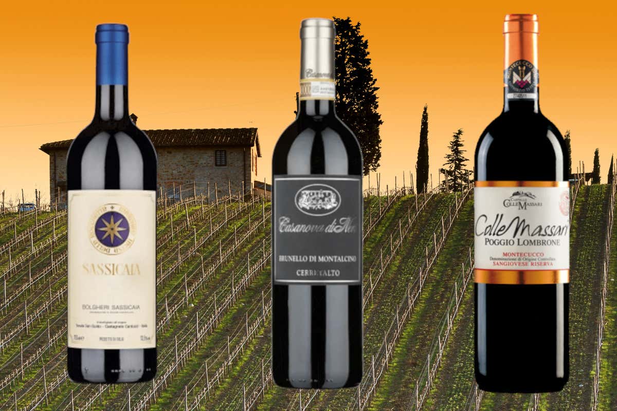Il Sassicaia di Tenuta San Guido, il Brunello di Montalcino Cerretalto di Casanova di Neri e il Montecucco Sangiovese Poggio Lombrone Riserva di Collemassari