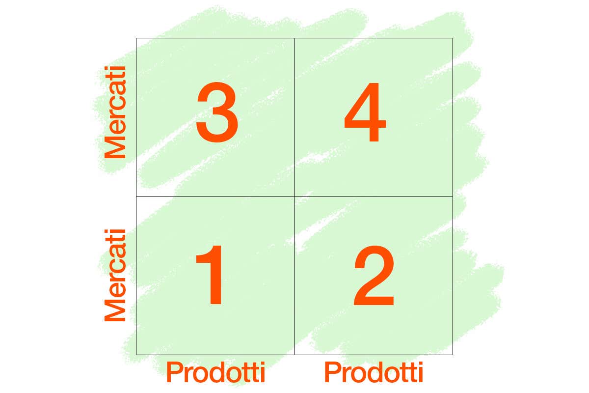 Il quadrante 3 significa che ad invarianza di prodotti (oramai da intendere il catalogo già ampliato quando mi sono diretto al quadrante 2) mi cimento su altri mercati. È l’export, ragazzi! Irrobustisco la struttura aziendale, stabilisco contatti, rendo efficienti i canali in rete, e tanto altro ancora.
