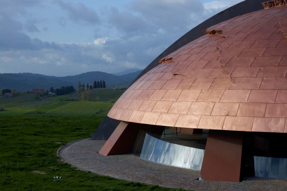 Le crepe che attraversano la superficie della cupola rameica richiamano i solchi del terreno umbro