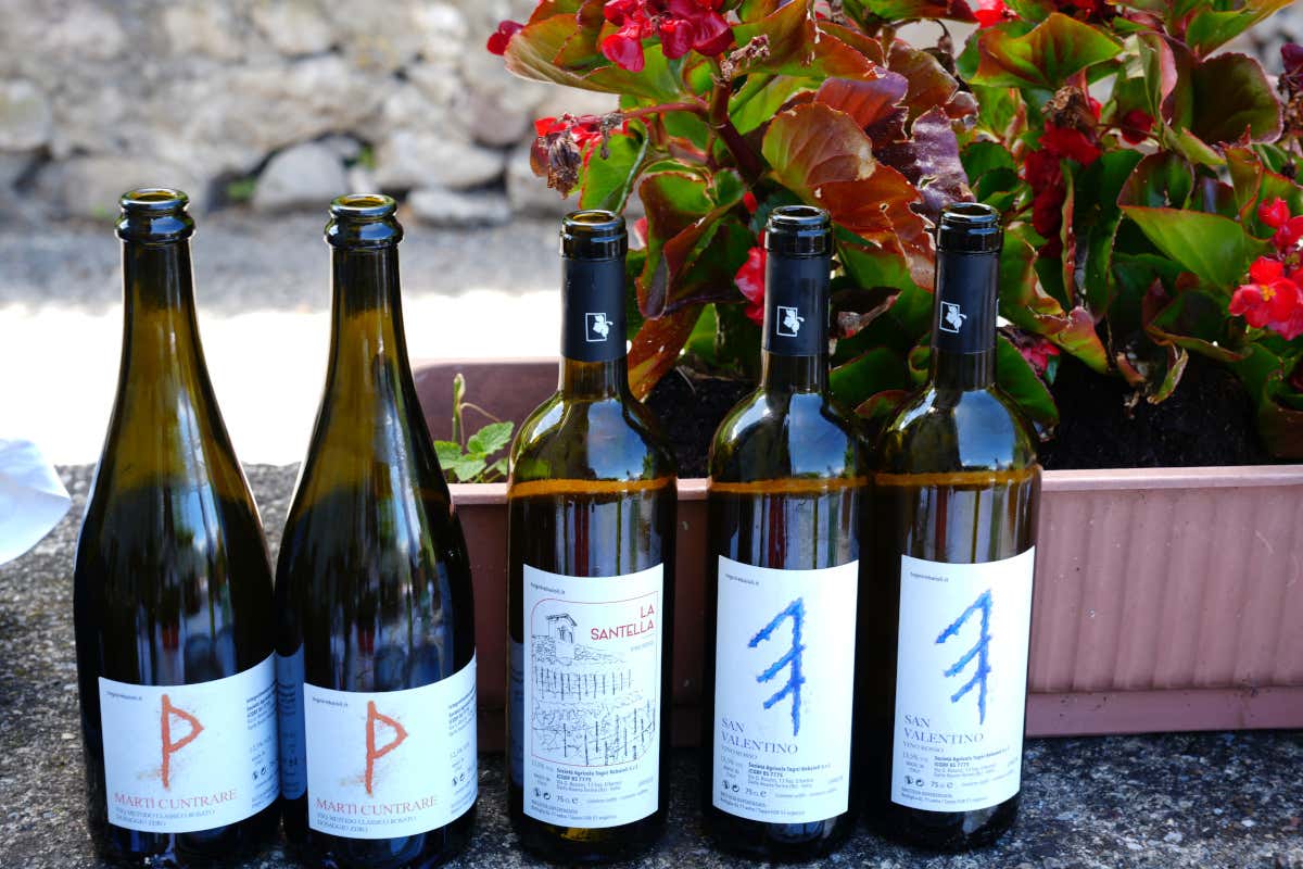 1703, i metri del monte Altissimo tra Val Camonica e Val di Scalve, è Nebbiolo in purezza, Martì Cuntrare - Bastian Contrario - Metodo Classico rosé non dosato si compone in parti uguali di Barbera ed Erbanno, vitigno autoctono camuno che si rivela essere un biotipo del Lambrusco Maestri. A queste due etichette si aggiungono La Santella, uvaggio di vitigni aziendali, il San Valentino e il Martina, entrambi 100% Erbanno, di cui il secondo vinificato in rosa, il Maraea - Meraviglia - da Souvigner Gris, vitigno Piwi (dal tedesco Pilzwiederstandfähig, resistente alle crittogame), lo Scabe - dal Gaì - l’antica lingua segreta dei pastori, sinonimo di vita rude e libera, selezione di vitigni aziendali vinificati in Perpetuo, per giungere alla Riserva 8 ½, che rappresenta e celebra il progetto comune, selezione di Nebbiolo da vecchie vigne, condividendo l’omaggio felliniano dei ristoranti di Bombana. Tratti comuni di questa variegata produzione sono l’approccio in vigna, biodinamico come detto, il terreno dei vigneti, calcareo, ricco di scheletro, sciolto e profondo, le vinificazioni particolari, una visione assolutamente libera e personale.