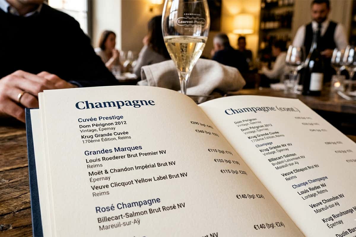 selezione di Champagne in un ristorante di lusso: il primo sguardo sulla carta dei vini racconta stile e personalità del locale