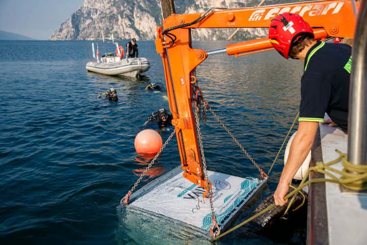 I vigili del fuoco calano sul fondo del lago il cassone con le bottiglie di spumante - le fucoo Le bollicine del Brezza Trentodoc maturano sul fondo del Garda