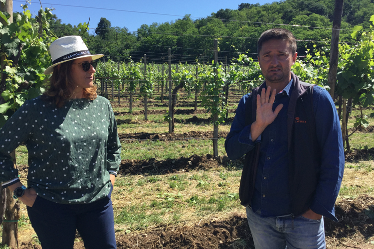 Francesca Moretti ha scelto una passeggiata in vigna guidata da Alessandro Bonzoni, responsabile dei 190 ettari di Bellavista, per far capire e toccare con mano la passione e la cura necessari per creare grandi vini
