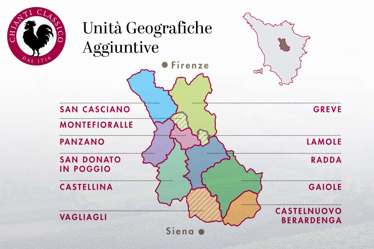 «Un’importante novità - commenta il Consorzio del Chianti Classico - approvata dall’Assemblea dei Soci a giugno 2021 e volta alla suddivisione del territorio di produzione in zone più ristrette e dotate di maggiore omogeneità, le Unità geografiche aggiuntive, per arrivare ad indicarne il nome in etichetta. Fra gli obiettivi, quello di rafforzare la comunicazione del binomio vino-territorio, aumentare la qualità in termini di identità e territorialità, consentire al consumatore di conoscere la provenienza delle uve e, non ultimo, stimolare la domanda attraverso la differenziazione dell’offerta. Per questo sono state individuate e delimitate undici Unità Geografiche Aggiuntive all’interno della zona di produzione del Chianti Classico, distinguibili in base a una combinazione unica di fattori naturali (composizione del suolo, microclima, giacitura dei vigneti, ecc.) e fattori umani (storia culturale, tradizioni locali, spirito di comunità).»